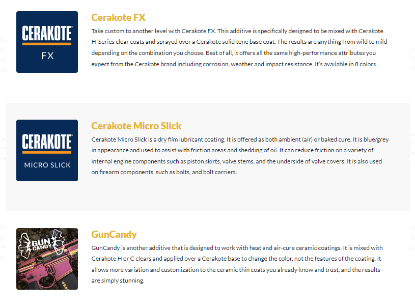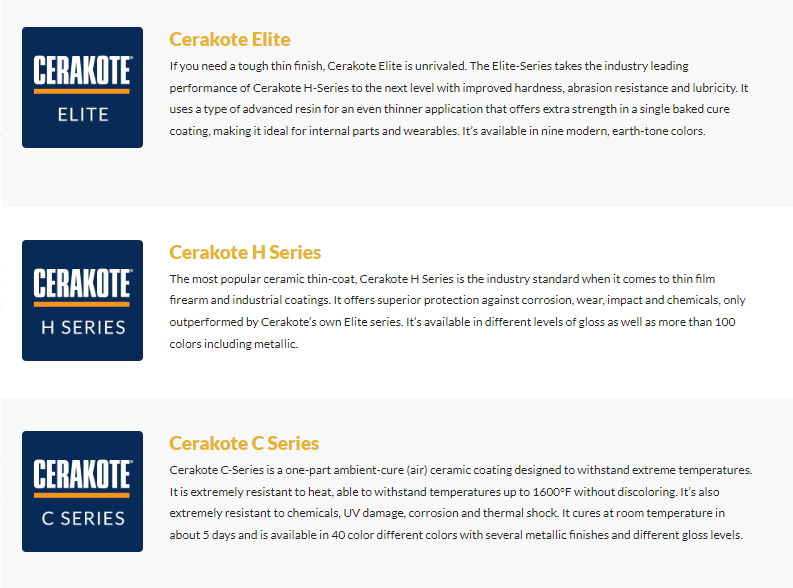 The world leader in film ceramic coating technology, Cerakote is available in a wide variety of colors and finishes. Our partner, Grage Industries, is proud to offer trained and certified application of the following Cerakote products and specialty coatings.
